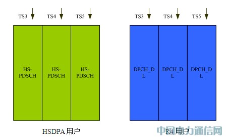如圖5所示,使用可變屬性時隙空分復用技術,在TS3、TS4、TS5上實現HSDPA用戶的共享信道和R4用戶的下行DPCH信道的空分復用。