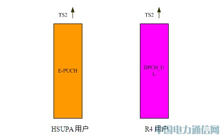 如圖6所示,使用可變屬性時隙空分復用技術,在TS2上實現HSUPA用戶的共享信道和R4用戶的上行DPCH信道的空分復用。