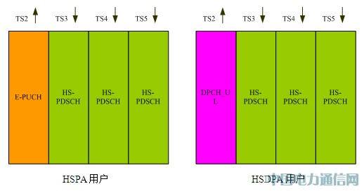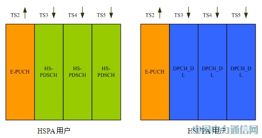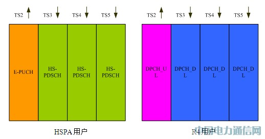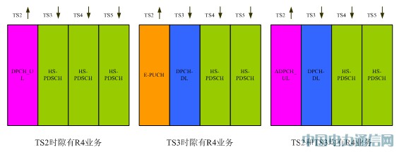 如圖7所示,使用可變屬性時隙空分復用技術,在TS2、TS3、TS4、TS5上實現HSPA用戶的上下行共享信道和R4用戶的上下行DPCH信道的空分復用。