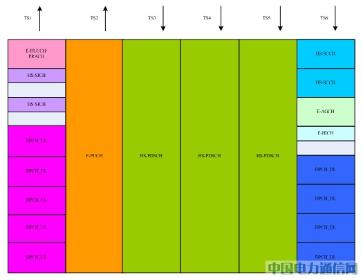 隨著TD現網中HSUPA特性的開啟,HSUPA技術正式步入商用。HSUPA和HSDPA共載波配置,相比于HSDPA載波,增加了HSUPA相關的共享控制信道(E-AGCH和E-HICH)、共享業(yè)務信道(E-PUCH)以及增強隨機接入信道(E-RUCCH),上下行時隙的配置發(fā)生了明顯的變化,下圖是HSUPA特性引入后的時隙典型配置。