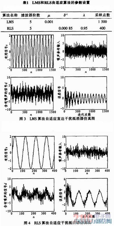 LMS算法實現(xiàn)簡單,但為保證算法收斂不得不將收斂因子μ取得很小,這導(dǎo)致了算法收斂較慢;RLS算法不對信號統(tǒng)計特性做假設(shè),為確定性最佳優(yōu)化問題,收斂更快,估計精度更高,為獲得更好的直達(dá)干擾抑制性能,可采用RLS算法做自適應(yīng)直達(dá)抵消濾波器的算法。