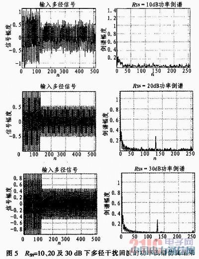通過計算機(jī)仿真可得,信噪比分別為RSN=10、20及30dB情況下,功率倒譜仿真曲線如圖5所示。可見,只要RSN足夠大(≥20dB)的情況下,可以有效地進(jìn)行多徑干擾信號的分解。通過功率倒譜反運(yùn)算(求fft、冪運(yùn)算和ifft等),可獲得多徑干擾抑制后的回波信號。