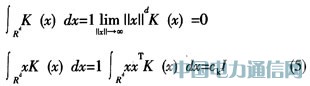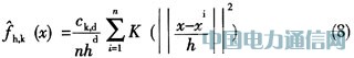 帶寬矩陣H一般選擇對角陣,H=diag[h12,…,h2d]或與單位矩陣H=h2I成比例。H=h2I情況下的一個明顯優點是只需帶寬參數h>0。然而,從式(4)可以看出,首先應確定用于特征空間的歐幾里德矩陣的有效性。若使用一個寬度參數h,則式(3)就會變成如下典型的表示式: