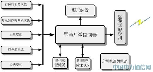 圖一 無線型睡眠呼吸暫停癥監(jiān)視系統(tǒng)方塊圖