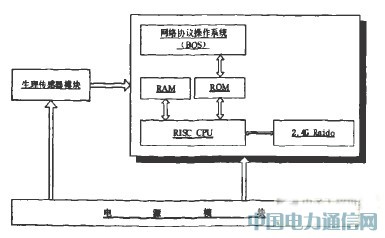 本文提出的構架基于WPAN,即區別于無線遠程醫療。本文關注重點在于生理信號采集到生理信號中轉部分的無線方式。無線醫療監護方式主要由傳感器節點、無線數據傳輸模塊和接受節點構成。接受節點可接人監控中心,或者由以太網、無線廣域網等方式接入監控中心,以此構成了完整的醫療監護網絡。在此構架下,醫用傳感器節點可以按照具體情況配置,構成局域或者家庭的無線醫療監護網絡,這種構架具有很大靈活性和擴展性。在這個構架中,我們無線通信方式以Zigbee協議為基礎,采用JN5121模塊作為無線收發節點。圖l中描述了無線醫療監護的系統結構圖。