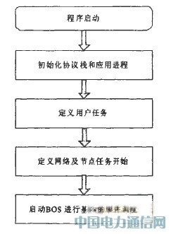 在Jennic Zigbee協議中一個基本的操作系統(BOS)。它是一個簡單的時問調度器。它允許兩個任務進程間通過一個簡單的信息調度機制進行通信。同事BOS控制Zigbee協議棧任務和用戶任務的執行。其中協議棧任務包括:網絡層、應用子層APS(ApplicaTIon Sub—Layer)和Zigbee設備對象ZDO(Zigbee Debice 0bjects)的所有進程。通過事件的輪詢應用實現進程的調度。整個流程如圖3所示。