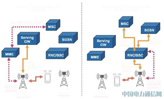 ●CSFB=CS回退(CSfallback),該方案不使用LTE中的信令連接,并通過2G/3G網絡建立語音連接。基于SV-LTE的UE使用兩個獨立的空中接口,這兩個接口同時用于不同的服務。語音通過2G/3G網絡傳輸,LTE則專門用于數據傳輸。然而,這種簡單的解決方案能耗較大,因此對電池的使用壽命不利。