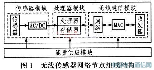 傳感器節(jié)點一般由傳感、數(shù)據(jù)處理、無線通信和供電等4個模塊組成,如圖l所示。