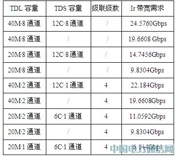 隨著LTE及雙模演進的需求日益臨近,Ir口傳輸帶寬受限的問題愈發凸顯。TD-LTE對Ir傳輸帶寬的需求遠遠大于TD-SCDMA,在TD-LTE及雙模應用場景中,Ir傳輸帶寬需求遠遠超出目前6Gbps的主流光口配置。下表列舉了幾種典型應用場景下的Ir傳輸帶寬需求: