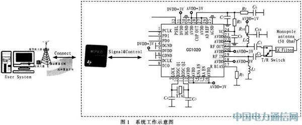 射頻部分采用TI公司CC1020作為射頻控制單元,該芯片為業(yè)界首例真正的單芯片窄帶超高頻收發(fā)器,有FSK/GFSK/OOK 3種調(diào)制方式,最小通道間隔為50kHz,可滿足多通道窄帶應(yīng)用(402~470MHz以及804~940MHz頻帶)的嚴(yán)格要求,多個工作頻段可自由切換,工作電壓2.3~3.6V,非常適合集成擴展到移動設(shè)備作為無線數(shù)傳或電子標(biāo)簽使用。該芯片遵從EN300 220.ARIB STD-T67以及FCC CFR47 part15規(guī)范。