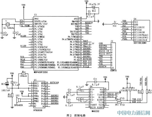 控制單元采用業(yè)界低功耗應(yīng)用比較成熟的TI公司生產(chǎn)的MSP430系列,該系列是TI1996年開始推向市場的一種16位超低功耗的混合信號處理器(Mired Signal Proessor),其針對實際應(yīng)用需求把許多模擬電路、數(shù)字電路和微處理器集成在一個芯片上,提供“單片”解決方案。在WIS系統(tǒng)中OBU和BSS中工作原理相同,所以重點介紹OBU部分設(shè)計,其控制部分原理圖如圖2所示。