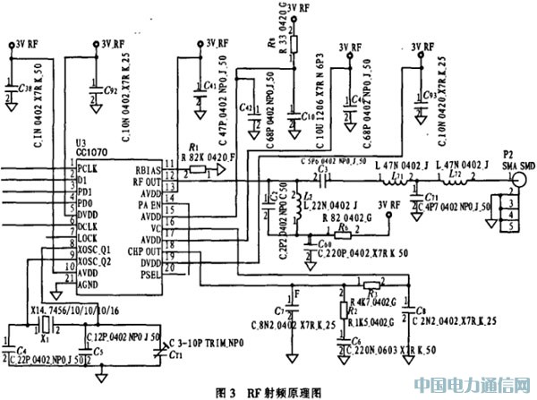 選擇載頻頻率430MHz為工作頻段,此頻段為ISM頻段,符合國家無線管理委員會標(biāo)準(zhǔn),無需申請頻點。采用FSK的調(diào)制方式,擁有較高的抗干擾能力和低誤碼率,采用前向糾錯信道編碼技術(shù),提高了數(shù)據(jù)抗突發(fā)干擾和隨機干擾的能力,在信道誤碼率為10-2時,可得到實際誤碼率10-5~10-6。在開闊地視距條件、波特率為2A Kbs、大吸盤天線(長度2m,增益7.8dB距離地面高度2m)時數(shù)據(jù)傳輸距離可達(dá)800m。該RF芯片標(biāo)準(zhǔn)配置可提供8個信道能夠滿足多種通信組合方式。由于采用窄帶通訊技術(shù),增強了通訊穩(wěn)定性和抗干擾性。射頻部分原理圖如圖3所示。