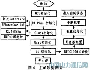 程序采用模塊化設(shè)計,用C語言編寫。主要由4部分在組成:主程序模塊、通信程序模塊、外圍電路處理模塊、中斷和存儲模塊。主程序主要完成控制單元的初始化、各種參數(shù)的配置及各外圍模塊配置和初始化等;通信程序模塊主要處理對RF芯片的配置以及433MHz收發(fā)處理;外圍電路處理模塊主要對系統(tǒng)外部LED指示、電壓檢測、聲音提示以按鍵及其他處理;中斷和存儲模塊主要處理系統(tǒng)中斷和記錄存儲。主程序流程如圖4所示。