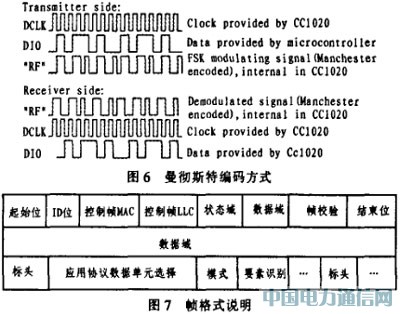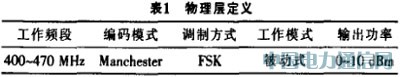 1)物理層 物理層主要是通信信遭標(biāo)準(zhǔn),由于目前國際上尚未形成關(guān)于433 MHz短距離無線通訊統(tǒng)一的標(biāo)準(zhǔn),各種標(biāo)準(zhǔn)定義的物理層也不盡相同,如表1所示。圖6為曼徹斯特編碼方式。