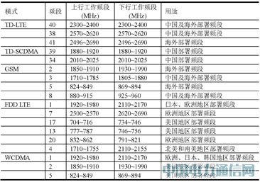 對于運營商而言,LTE引入后不但要求其終端在原有多模的基礎上增加支持LTE模式及相應的工作頻段,還要增加可以確保用戶實現國際漫游的工作頻段。不同于2G/3G時代,目前全球分配的LTE頻譜眾多且相對離散,為更好地支持國際漫游,終端需要支持較多的頻段。以中國移動為例,TD-LTE引入后,為滿足自身的運營需求,終端至少需要支持TD-LTE,TD-SCDMA,GSM三種模式和八個頻段來確保業務的連續性,具體參見表1。為提升用戶的國際漫游體驗,終端還要支持FDD LTE模式,結合全球FDD LTE部署現狀,目前NGMN建議終端至少需支持Band1/7/17(或13)3個頻段才能實現通過FDD LTE漫游到日本、歐洲、美國的部分地區,而且隨著FDD LTE在全球部署規模的逐步擴大,終端還要增加新的FDD LTE頻段才能實現全球漫游。考慮到WCDMA的全球部署范圍廣、成熟度高且漫游能力強,為提升終端的國際漫游能力,還將鼓勵終端支持WCDMA模式及相應的工作頻段。表1給出了全球各制式主流部署頻段。