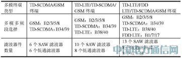 為了抑制外界干擾信號對終端接收信號靈敏度的影響,同時抑制發射通路射頻信號的帶外干擾,通常需要在TDD系統射頻前端的接收通道和發射通道上分別配置SAW濾波器和低通濾波器,而對于FDD系統,則需要配置雙工器來解決射頻前端接收通道和發射通道的濾波問題。由于濾波器件數量是隨著頻段數量增加而線性遞增的,且LTE系統采用的又是接收分集,所以在LTE上增加支持新的頻段會比在TD-SCDMA(或GSM)上增加支持相同數量的頻段對終端濾波器件數量影響更為明顯。如表2所示,現有的TD-SCDMA/GSM終端支持6個頻段需要12個射頻前端濾波器件,而TD-LTE/TD-SCDMA/GSM終端支持8個頻段則需要18個射頻前端濾波器件,較前者多支持2個頻段卻多增加了6個濾波器件。同時,TD-LTE/FDD LTE/TD-SCDMA/GSM終端若支持11個頻段則需要24個射頻前端濾波器件。如此數量眾多的濾波器件通常都是分立器件,再加上外圍的匹配電路,無疑將嚴重影響整個終端設計的集成度,進而導致終端在成本、體積、市場競爭力等方面面臨嚴峻挑戰。