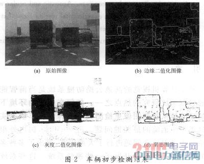 車輛初步檢測的流程如圖1所示。車輛陰影和車道一樣具有灰度突變的特點,因此可以調用車道檢測算法對圖2(a)中的原始圖像做二值化處理,得到圖2(b)中的邊緣二值化圖像。同時還要對原始圖像進行灰度二值化,得到圖2(c)中的灰度二值化圖像。為提高檢測實時性,以本車附近路面區域的平均灰度作為二值化閾值。由于邊緣二值化圖像和灰度二值化圖像都包括了車輛的下底邊,將這兩幅圖像進行“或”運算,就可以得到如圖2(d)所示的車輛陰影圖像。