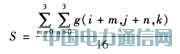 d)比較。s與第k一l幀對應子塊平均值。s(i,j,k一l),若差值小于閾值T1時,轉步驟e,否則轉步驟f。其中,閾值T1=(1.3σv)2。