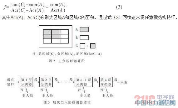 為快速提取弱特征,將其轉化為兩個矩形區域的求取運算,以第13種弱特征為例,正負區域運算圖如圖2所示。先將負矩形合并為一個矩形,即圖中A區域所示;然后求取九個區域的灰度和,即圖中C區域像素灰度和,最后通過C和A求取B區域像素灰度和。根據式(2),可得sum(B)=sum(C)-sum(A)。特征區域面積也可以通過類似方法求取。根據式(1)可得到:
