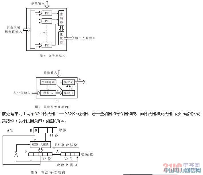 分類器由若干弱分類器和外圍電路構成,其內部結構如圖6所示,其中每一個弱分類器(PE)內部結構如圖7所示,PE每部分實現的功能分別是:模塊A:計算該窗口的微結構特征值e;模塊B:歸一化處理微特征值e得f;模塊C:得出該窗口微特征閾值b;控制電路:控制模塊間的時序即PE內部與外部的數據交換。