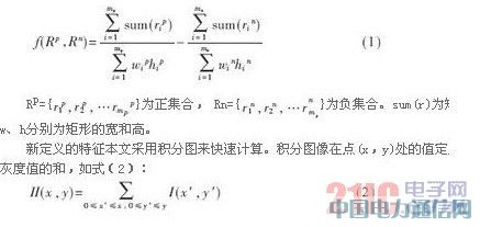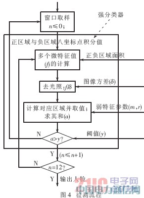 檢測流程:(1)讀入取樣窗口和弱特征信息,求出每層的若干微特征值;(2)將微特征值除以窗口的灰度方差,得到歸一特征值(f),實現歸一化處理;(3)讀入此微特征訓練所得的參數(m,r),將歸一特征值進行處理:h=(f-m)/r;(4)輸出h,從查找表中取出對應的函數值b;(5)將強分類器所包含弱分類器對應的輸入值相加:a=Σb;并將a與當前層的閾值y比較;判斷通過與否。