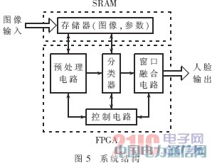 整個系統分為片內、片外兩部分,系統結構如圖5所示。其中,片外(即存儲器,存儲圖像和參數);片內,即FPGA,由四部分組成:(1)預處理電路:計算積分圖像,微特征對應的正負區域和采樣窗口的灰度方差;(2)分類器:檢測出人臉窗口;(3)窗口融合電路:融合鄰近的人臉窗口;(4)控制電路:控制片內片外的數據傳輸及片內電路的時序。