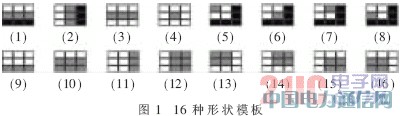考慮到特征的表示能力和運算速度,文中只選擇了其中16種表示能力強且易于快速運算的形狀作為弱特征庫,16種形狀模板如圖1所示。