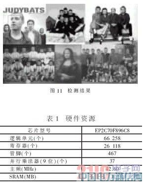 輸入圖像為256×256像素,其檢測效果如圖11所示。對此種輸入圖像采用縮放因子的s=1.3,平移因子的d=2.5,搜索從30×30像素到255×255像素范圍內的人臉。整個系統用VHDL語言描述,表1為所用硬件資源情況。