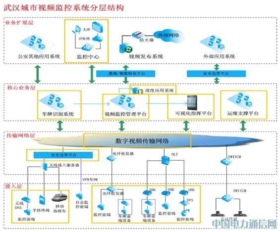 烽火科技作為國內優秀的信息通信領域設備與網絡解決方案提供商,致力于信息通信領域,積極參與城市信息化進程,推出以物聯網技術體系架構的智能監控和安全管理的兩大解決方案,烽火科技視頻監控方案按照邏輯層次結構可分為系統接入層、傳輸網絡層、核心業務層、業務擴展層,烽火科技主導的已經啟動實施的武漢城市視頻監控項目為例,結構如下: