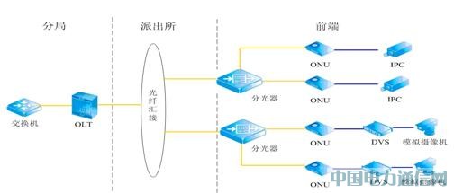 ▪ ONU置于前端部分,下接攝像機。已建監控點的模擬視頻通過視頻光端機(DVS)接入與ONU相連,新建網絡攝像機直接與ONU通過五類線連接,接入數字視頻專網。