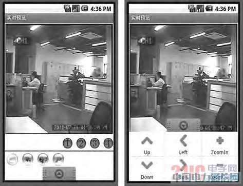 目前,該系統已經在實驗室進行測試,服務器輸出15fps CIF 格式的H. 264 視頻數據,客戶端安裝在Android 手機上,通過WIFI 接入無線局域網中與服務器建立連接,用戶界面如圖4 所示,可實現遠程視頻預覽、云臺控制等操作。