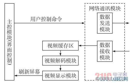 基于Android 平臺的監控客戶端的總體框架如圖2 所示,分別由網絡通訊模塊、視頻解碼模塊以及視頻顯示模塊等構成。其中網絡通訊模塊接收來自服務器的所有數據,對數據進行解析,并將視頻數據存入到視頻緩沖區。視頻解碼模塊負責從視頻緩沖區中讀取數據并送入H. 264 解碼器進行解碼。最后,采用OpenGL 圖形庫將解碼后圖像繪制到屏幕上實現視頻播放。