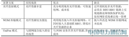 C-RAN要實現(xiàn)低成本的光網(wǎng)絡(luò)傳輸技術(shù),因此BBU和RRU之間CPRI/Ir/OBRI接口的高速光模塊的實現(xiàn)方案將成為影響這個系統(tǒng)經(jīng)濟(jì)性的重要環(huán)節(jié)。當(dāng)前可行的部署方案有光纖直驅(qū)模式、WDM傳輸模式和基于UniPon的傳輸模式三種(見表1)。