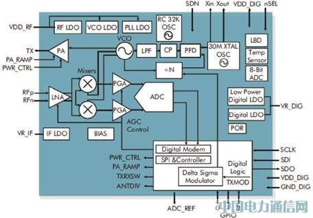 圖1是EZRadioPRO系列中的收發器芯片Si4432的原理框圖。可以看到,該芯片接收部分集成了低噪聲放大器、可編程增益放大器、自動增益控制電路,而可編程增益放大器的輸出信號被內部ADC轉化為數字信號,后續的信號處理均采用數字信號處理技術實現,保證了芯片工作的可靠性。要發送的數據經過數字調制器調制后,由內建的功率放大器發射出去,Si4432實現了數字調制解調器的功能,芯片內部還集成了電池電壓檢測器、溫度傳感器以及一個可供用戶使用的8位ADC。