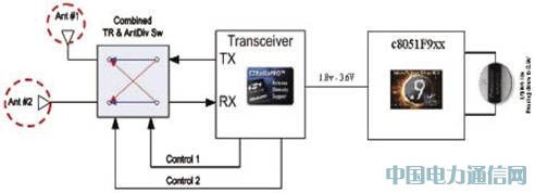 EZRadioPRO集成的天線分集算法可以改善無線鏈路的性能。通過使用兩個天線和天線分集算法,EZRadioPRO可以選擇最佳的天線接收數據,從而獲得更優的性能。天線分集算法在分析前端碼時,比較兩個天線的接收強度,自動選擇最佳的天線。EZRadioPRO的天線分集有以下好處:1、抑制多徑衰落和天線極化效應,以改善鏈路質量;2、通過消除盲區來增加通信范圍和距離;3、因為天線分計算法是由無線芯片來實現的,所以無MCU開銷;4、節省功耗,因為相同的通信范圍可以使用較低的功率。對于一個典型系統,天線分計算法可增加+8dB~10dB的鏈路預算。圖2中示出了使用天線分集算法的典型系統。