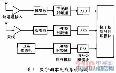 GPS抗干擾系統如采用數字調零天線,按信號輸出形式分為射頻輸出和中頻輸出兩種設計方案。由于當前大量投入使用的普通GPS衛星接收機未到淘汰年限,并且沒有抗干擾功能。如果采用射頻輸出的抗干擾調零天線方案,可以在保持原有接收機結構條件下,僅替換射頻端就可以實現接收機的抗干擾功能,具有較高的經濟效益;而最新開發的GPS接收機多采用數字調零中頻輸出方案,這種方案結構簡單,實現難度低,質量穩定可靠。文中GPS抗干擾系統采用數字調零天線射頻輸出的方案,而中頻輸出方案則可通過修改射頻輸出方案來實現。