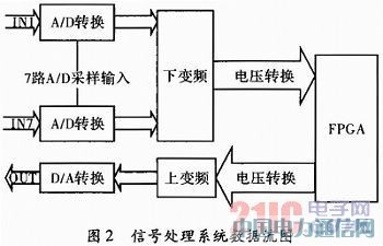 在信號處理系統硬件設計之前,需要明確信號處理系統的數據流向,首先由7路中頻模擬信號進入信號處理系統,通過采樣把模擬信號轉換成數字信號,然后經過下變頻芯片把中頻信號變為基帶信號,電平轉換后送給FPGA實現抗干擾調零算法,最后由FPGA發出信號經過電平轉換和上變頻,通過數模轉換變成中頻模擬信號送給射頻模塊。