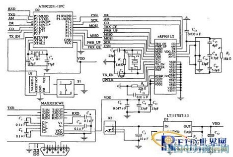 微控制器通過SPI接口控制nRF905,其中微控制器(MCU)采用Atmel公司生產的低電壓、高性能COMS8位單片機 AT89C2051,該微控制器兼容標準MCS51指令系統,內含128B的隨機存取數據存儲器RAM和2kB的可反復擦寫FLASH只讀程序存儲器,可以將驅動及控制nRF905的程序寫入該閃存,無需外接EPROM而簡化了電路設計降低了系統功耗。
