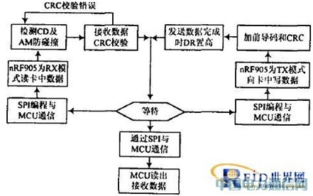 射頻卡與閱讀器的非接觸數據交換構成一個無線數據通信系統,數據通過nRF905在閱讀器和射頻卡之間無線傳輸。