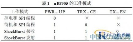 如表1所示,nRF905有2種工作模式和2種節能模式,由PWRUP,TRXCE,TXEN三個引腳控制。由于采用先進的 ShockBurst技術,使得數據能夠在微控制器中低速處理,在nRF905中高速發送,中間有很長的空閑時間,因此能夠節約存儲器和微控制器資源,減少編程時間。