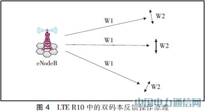 圖4示出的是LTE R10中的雙碼本反饋操作原理。預編碼器由W1和W2 2個部分構成:W1針對長期/寬帶信道特性,W2提供了深度完善方案以及關于信道的短期/窄帶性能的信息。