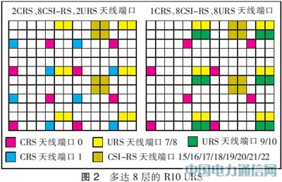 b)在多達8個空間層的支持下,與UE有關的預編碼正交參考符號用于數據解調。主要從3個方面證明這種選擇的合理性。首先,與UE有關的參考符號支持eNodeB處靈活的傳輸預編碼,它可以看作是競爭性下行鏈路MU-MIMO的一個引擎。其次,根據傳輸等級,參考符號開銷增加,因而一些高等級能力終端無法對整個系統(tǒng)進行懲罰,主要是由于參考符號開銷較高,這與采用CRS的情形類似。第三,與UE有關的參考符號將從發(fā)送預編碼增益中受益,這反過來又會導致可靠的信道估計。等級為1-2的LTE R10 URS模式對應于LTE R9中的URS模式,而等級為3-8的LTE R10 URS模式可看作是一種擴展。