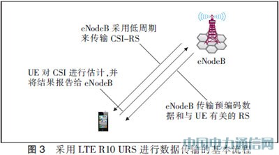采用CSI-RS的系統(tǒng)操作基本原理如圖3所示。終端基于CSI-RS來對CSI進行估計,并將CSI反饋傳輸給eNodeB,而eNodeB反過來可以在為數據選擇預編碼器和調制與編碼方案(MCS)用CSI。數據可以和與用戶有關(專用)的解調參考符號(URS,也稱為DM-RS)一同傳輸,與數據一樣,對同一物理資源塊進行擴展。相同的傳輸預編碼可用于數據層及相關的DM-RS端口。與LTE R8中的情形相反,它考慮了eNodeB使用任何預編碼的情況,因為使用的預編碼對于終端來說仍然是透明的,且不需要傳輸給用戶。