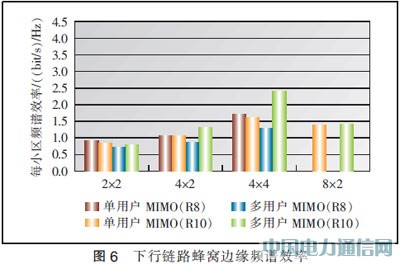 圖5給出了下行鏈路平均頻譜效率。假定eNodeB處使用的是均勻線性陣列,與采用2×2天線配置的R8相比,采用4×2天線配置的R10 MU-MIMO能夠將容量提高40%。與R8相比,采用4×4天線配置的MU-MIMO能夠將容量提高100%。使用4根發(fā)射天線的交叉極化陣列,增益數值略有減小。MU-MIMO對蜂窩邊緣數據速率的好處甚至要高于對平均數據速率的好處,如圖6所示:與采用2×2天線配置的R8相比,4×4天線配置能夠將蜂窩邊緣數據速率提高150%。但是,需要注意的是,蜂窩邊緣吞吐量、峰值吞吐量和平均吞吐量數值可能會相互折衷,這取決于調度和多用戶配對策略。已經證實,通過在第二空間層采用比例公平頻域調度,選擇保持公平性會導致覆蓋性能顯著提高。另一方面,選擇針對第二個用戶的頻域調度的最大C/I類型將會提升峰值吞吐量,從而以犧牲覆蓋范圍為代價,提高了平均吞吐量增益。