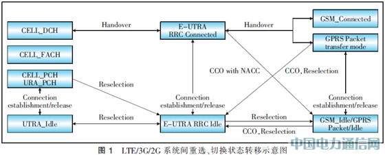 為了更好地保持業(yè)務(wù)的連續(xù)性、降低業(yè)務(wù)中斷時(shí)間、提升用戶體驗(yàn),3GPP定義了幾種由網(wǎng)絡(luò)側(cè)控制的切換機(jī)制:小區(qū)重選、重定向、PS切換和NACC。運(yùn)營商可以基于自己的基礎(chǔ)網(wǎng)絡(luò)情況和網(wǎng)絡(luò)演進(jìn)策略作出不同的選擇。圖1示出的是LTE/3G/2G系統(tǒng)間重選、切換狀態(tài)轉(zhuǎn)移示意圖。