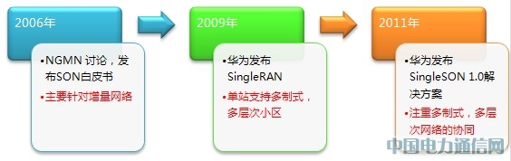 從2006年NGMN提出SON概念起,直到2010年,業(yè)界對SON的研究主要是針對LTE網(wǎng)絡(luò)。華為從2006年起開始研發(fā)LTE SON,但到2009年發(fā)布SingleRAN后意識到由于運營商將長期同時運維多制式、多層次網(wǎng)絡(luò),只研究LTE SON對運營商降低OPEX的作用有限, SON必須向多制式、多層網(wǎng)絡(luò)的方向發(fā)展并形成一個集中統(tǒng)一的解決方案,才能抑制運維成本-總收入的占比進(jìn)一步上升。由此,華為SingleSON解決方案在2011年應(yīng)運而生。SingleSON解決方案注重提高網(wǎng)絡(luò)規(guī)劃、部署、運維、排障過程的自動化程度,協(xié)調(diào)不同制式、不同層次網(wǎng)絡(luò)間的關(guān)系,提升全網(wǎng)運維效率。