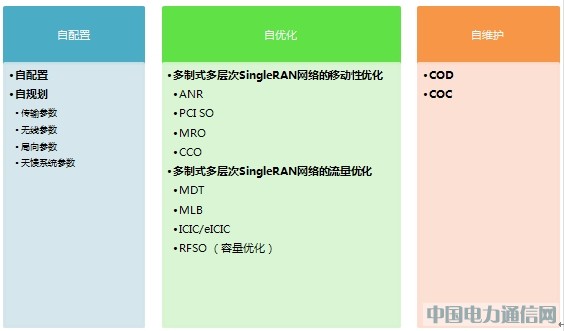 SingleSON主要包括下述3類特性,即自配置,自優(yōu)化和自維護(hù),如下圖所示: