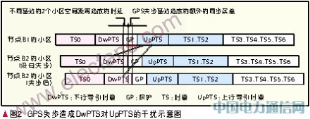TD-SCDMA為了避免小區(qū)之間下行DwPTS對(duì)UpPTS的干擾,在兩個(gè)時(shí)隙間留出了一個(gè)96碼片(chip)的保護(hù)(GP)時(shí)隙。在GPS失步的情況下,會(huì)導(dǎo)致DwPTS時(shí)隙和UpPTS時(shí)隙間的有效保護(hù)時(shí)間減少。如圖2所示。