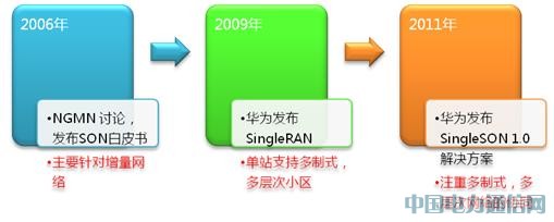 從2006年NGMN提出SON概念起,到2011年華為首次向業界正式發布了SingleSON解決方案。華為SingleSON解決方案實現了從單制式網絡到多制式網絡,以及到多層次網絡的自配置、自優化和自維護,標志著開啟運維自動化時代的新篇章。