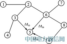 假設網內任意節點i,對應其所有的鄰居節點的時隙差值為Δtij,可以算出所有鄰居節點的時隙偏差值的加權平均值為εi,時隙修正量ωij。節點互同步過程如圖1所示,假設節點5能感知其鄰居節點(節點3、節點6、節點9)的參考時隙偏差Δt53(n)、Δt56和Δt59(n),從而計算出自己的時隙調整量: